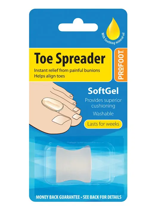 The profoot soft gel toe spreader relieves bunion and toe pain by the separating and properly aligning your big and second toe.Unlike tradational bunion and big toe relievers.Our soft gel toe spreader contain mineral oil which helps soften and prevents corns.