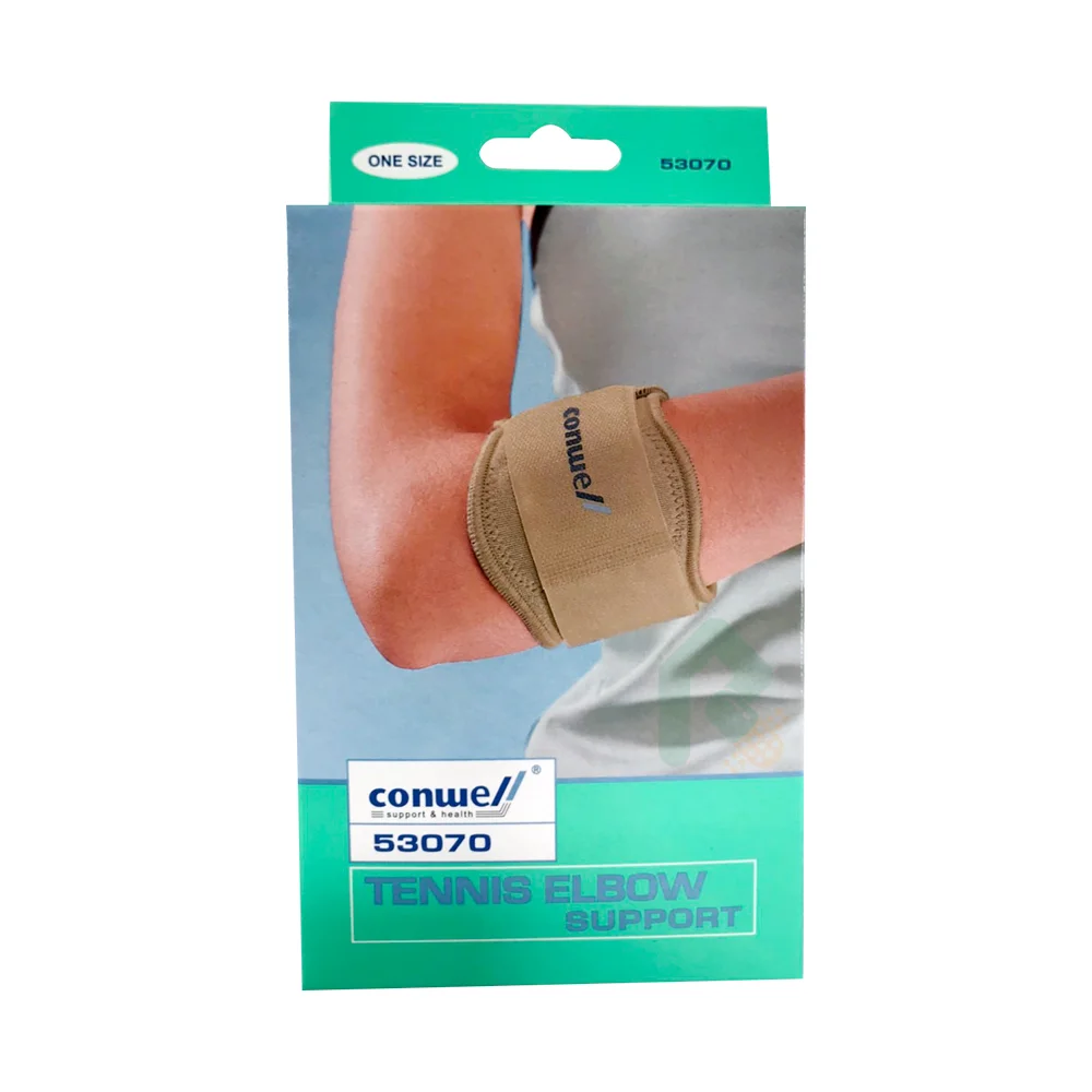 Conwell (53070) tennis elbow support apply pressure over tendon to help relieve’s painfull tennis elbow problems.Helps relieve pain and discomfort associated with the movement of forearm, neoprene with hook and loop compression strap.
