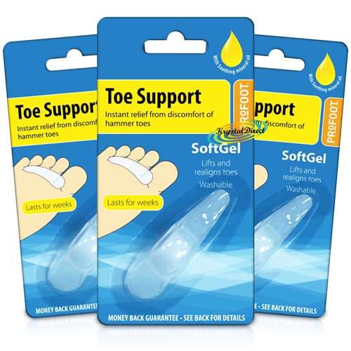 The soft gel toe support relieves pain and discomfort caused by clawed or hammer toes. By gently straightening and lifting toes,the soft gel toe support relieves pressure and friction at the tips. provides all day relirf. Lifts and realigns toes. Made by UK, profoot brands.